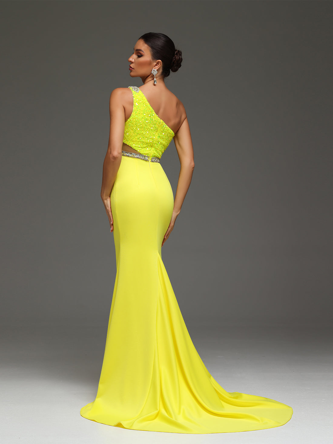 Camila Rhinestone Sequin Satin High Slit Maxi Dress