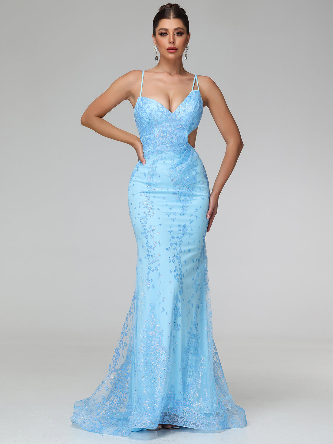 Glow effortlessly in the Hivera Rhinestone Open Back Maxi Dress. Covered in luminous rhinestones, this...