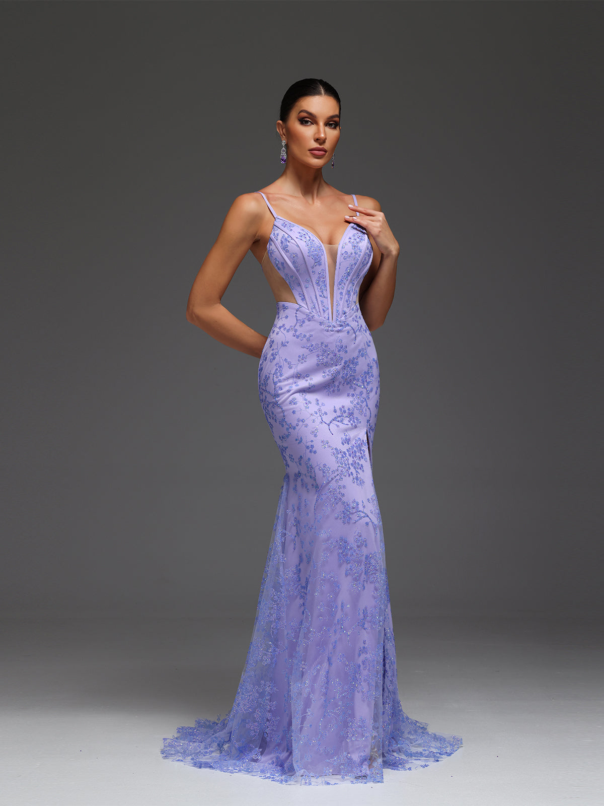 Fatima Beaded Sequin High Slit Cut Out Mesh Maxi Dress